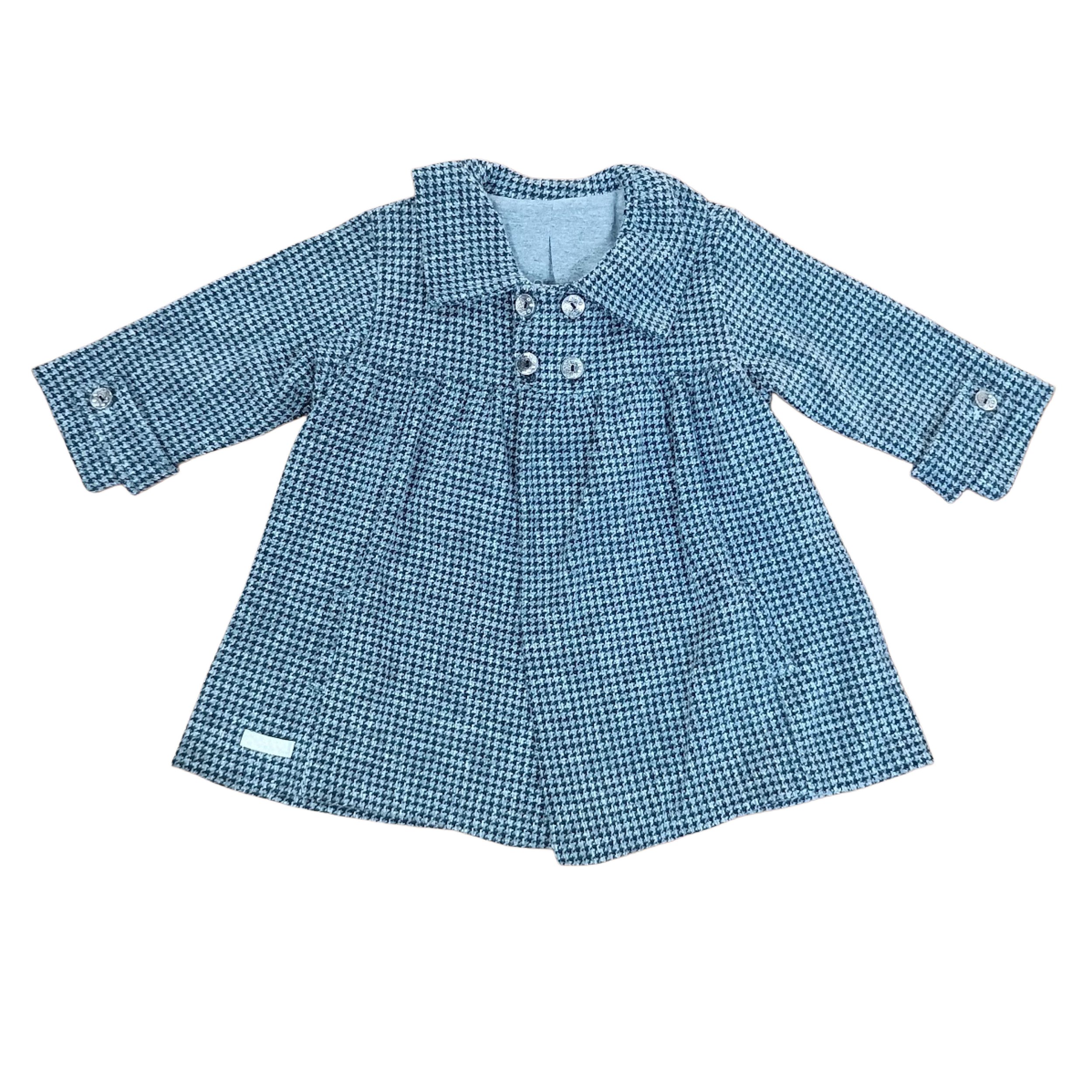 Casaco tipo sobretudo em estampa pied-de-poule nas cores azul claro e azul marinho em toda a peça. A peça da marca Beth Bebê possui gola estruturada, fechamento frontal duplo por botões em tom sobre tom e mangas 3/4 com acabamento diferenciado. Conta com modelagem evasê que proporciona movimento e amplitude, cintura levemente marcada para um caimento elegante e etiqueta bordada na barra lateral. O tecido com textura suave e o design clássico atemporal tornam o modelo perfeito para ocasiões especiais e passeios, garantindo sofisticação e conforto.