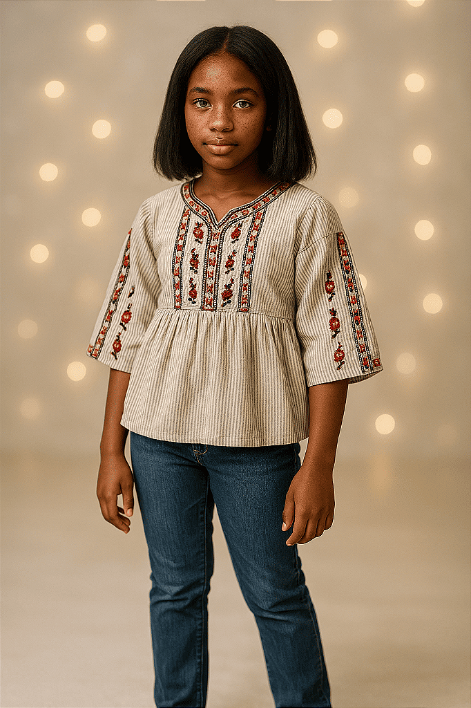 Blusa da marca Zara Kids, confeccionada em tecido leve com estampa de finas listras verticais em tom claro. O modelo apresenta mangas amplas em estilo flare, valorizadas por bordados florais em vermelho e detalhes coloridos que também aparecem na parte frontal e no decote. A peça tem recorte abaixo do busto, conferindo volume fluido à parte inferior, e fechamento discreto por botão na parte de trás. Um design com inspiração boho, que une conforto e estilo em um visual delicado e moderno.
