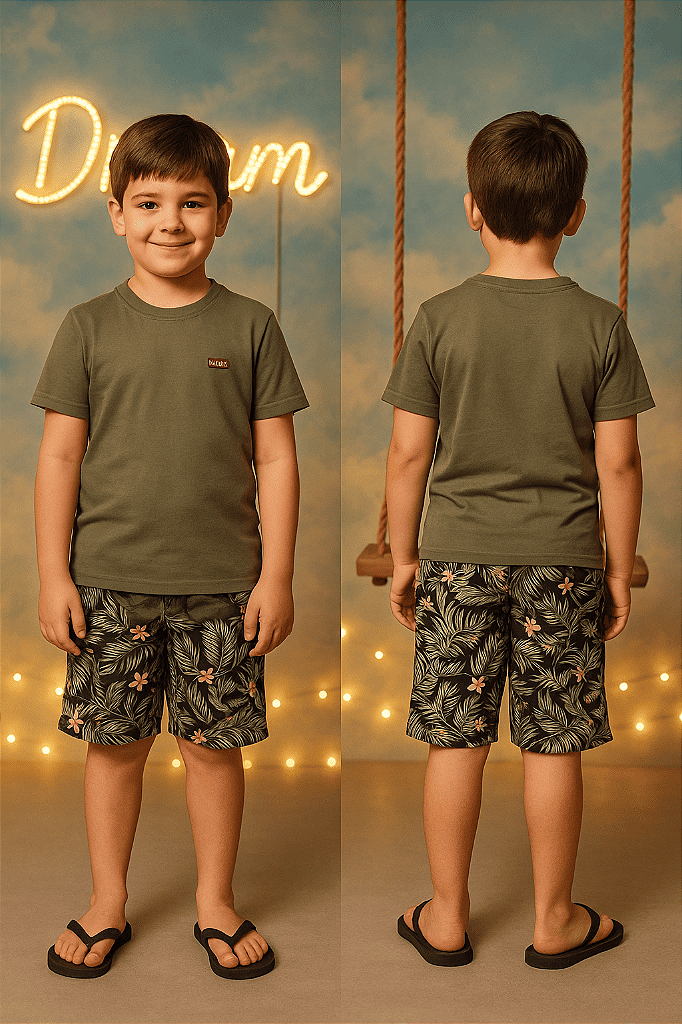 Bermuda da linha infantil Reserva Mini confeccionada em tecido leve de secagem rápida (100% poliéster), ideal para o uso na praia, piscina ou em atividades ao ar livre. O modelo tem modelagem reta, comprimento médio e estampa tropical com folhas em tons de verde-claro e flores em rosa claro sobre fundo preto, criando um visual vibrante e moderno.