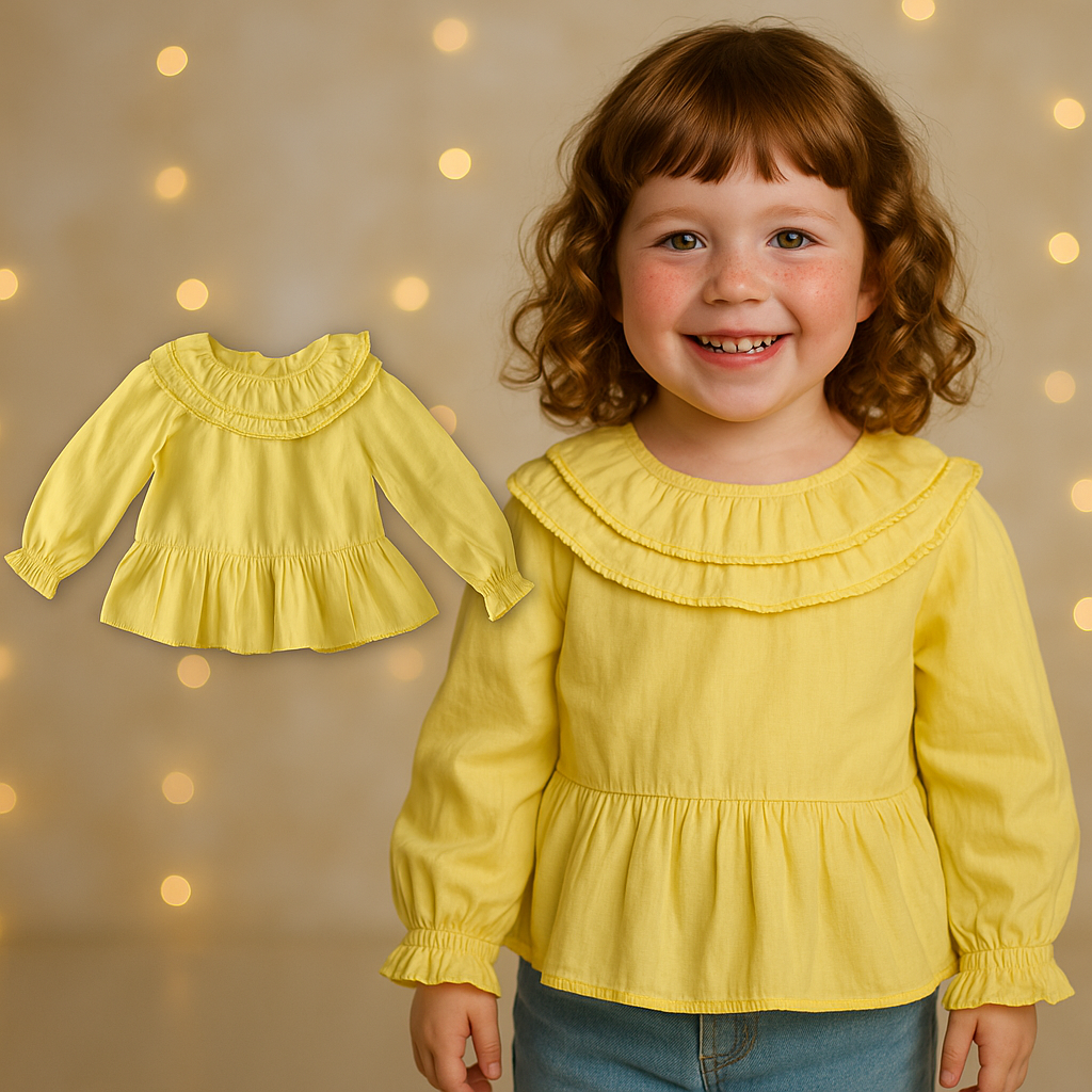 Blusa confeccionada em tecido leve de algodão, com modelagem solta e mangas longas. Apresenta gola ampla com camadas de babados decorados por acabamento em ponto picô, que adiciona delicadeza ao design. O corpo possui recorte na cintura com leve franzido, criando volume na barra. Fechamento posterior por botão, garantindo praticidade ao vestir.