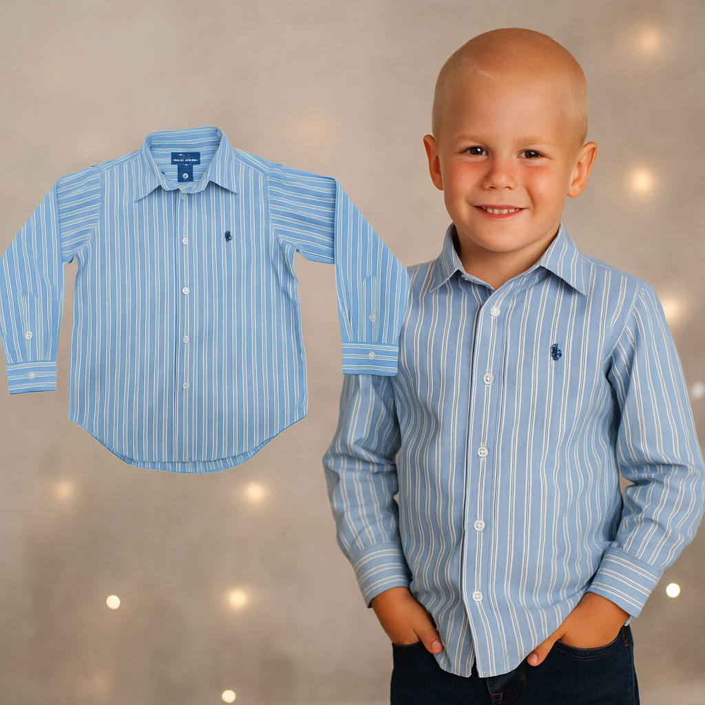 Esta camisa da Ralph Lauren combina elegância clássica com conforto para ocasiões formais e casuais. Confeccionada em algodão macio, apresenta estampa de listras verticais em tons de azul e branco, trazendo sofisticação ao visual. Possui gola tradicional, fechamento frontal por botões e punhos com abotoamento ajustável. O modelo conta ainda com o icônico logo da marca bordado no peito em tom contrastante, reforçando a autenticidade da peça. A modelagem é levemente alongada com barra arredondada, garantindo bom caimento e versatilidade no uso.Veste tamanho 6 anos.
