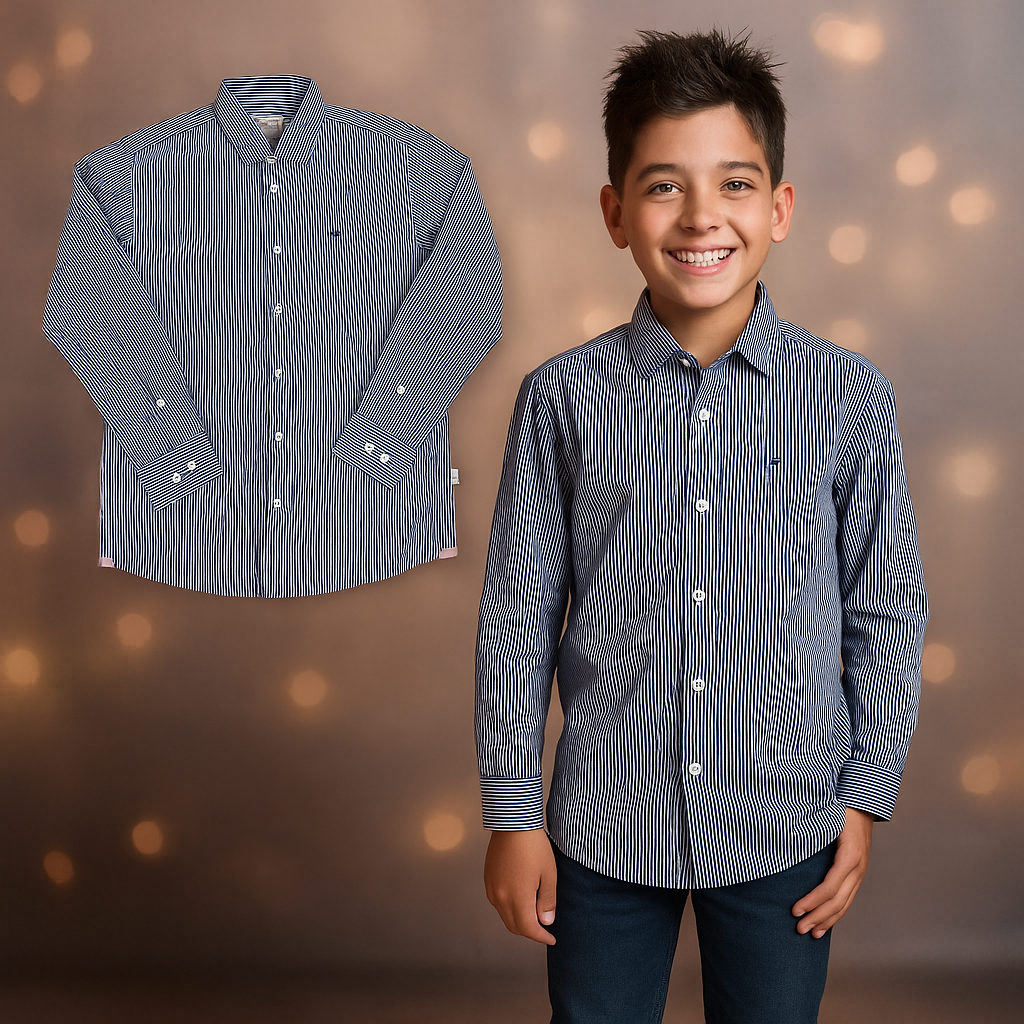Camisa infantil da marca VR, confeccionada em tecido leve e macio de algodão, com estampa listrada em azul marinho e branco. Possui modelagem clássica com gola tradicional, fechamento frontal por botões e punhos ajustáveis com abotoamento duplo.