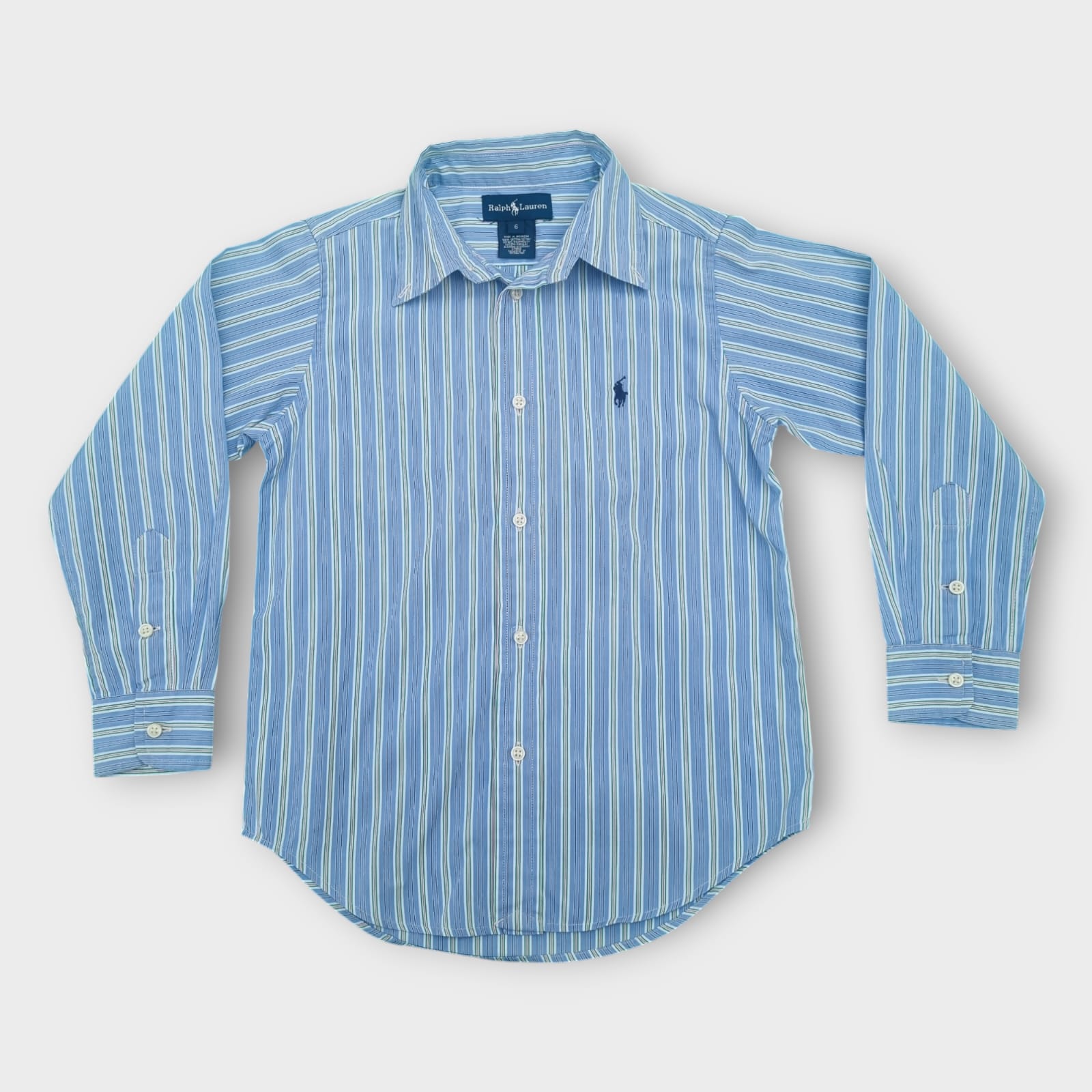 Esta camisa da Ralph Lauren combina elegância clássica com conforto para ocasiões formais e casuais. Confeccionada em algodão macio, apresenta estampa de listras verticais em tons de azul e branco, trazendo sofisticação ao visual. Possui gola tradicional, fechamento frontal por botões e punhos com abotoamento ajustável. O modelo conta ainda com o icônico logo da marca bordado no peito em tom contrastante, reforçando a autenticidade da peça. A modelagem é levemente alongada com barra arredondada, garantindo bom caimento e versatilidade no uso.Veste tamanho 6 anos.