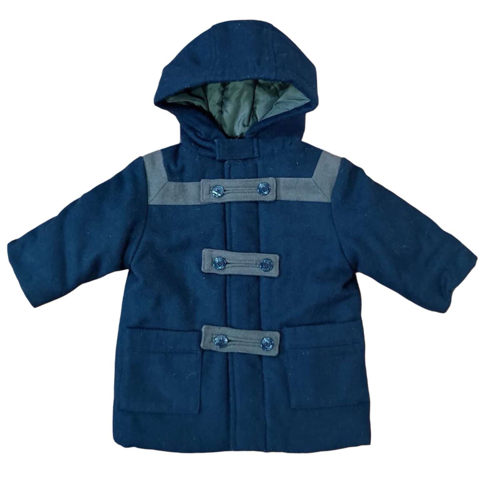 Casaco da marca Jacadi, confeccionado em material encorpado e acolchoado, oferecendo excelente proteção térmica e conforto para os dias frios. O modelo possui capuz integrado com forro em tecido verde água contrastante, fechamento frontal diferenciado com três pares de presilhas em tecido cinza e botões azul marinho, criando um visual sofisticado inspirado no estilo duffle coat clássico. Conta com detalhes contrastantes em cinza nos ombros e bolsos frontais embutidos, além de acabamento pespontado que reforça a estrutura da peça.