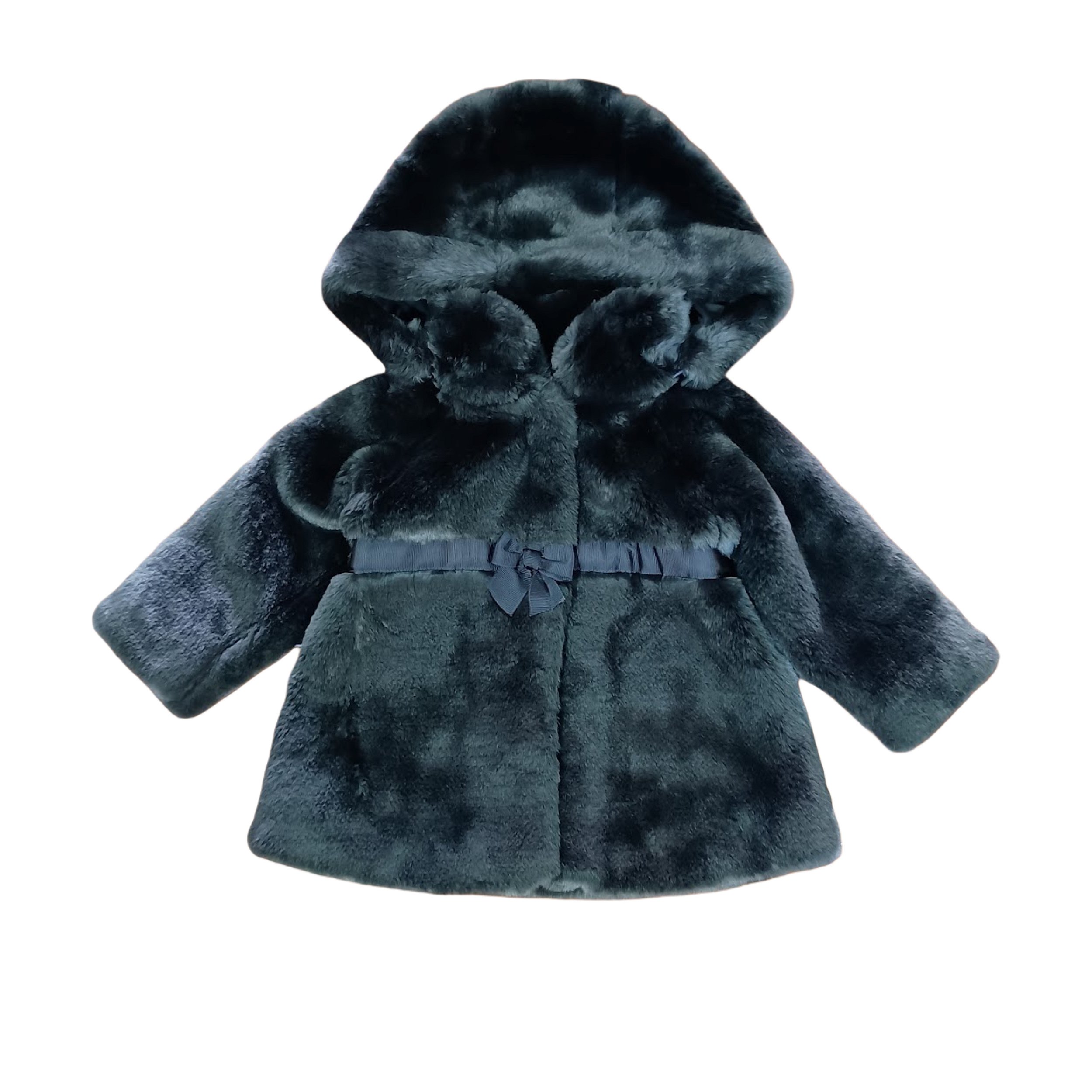 Casaco da marca Tartine et Chocolat, confeccionado em luxuoso tecido pelúcia com textura tipo pelo sintético ultra macio, oferecendo máximo conforto térmico e sofisticação. O modelo possui capuz integrado amplo e generoso, fechamento frontal por colchetes invisíveis que mantêm o design clean e elegante. Destaque para o delicado laço de fita de cetim azul petróleo na altura da cintura, criando um detalhe romântico e refinado. Mangas longas com acabamento em punhos de pelúcia. Modelagem levemente evasê que garante amplitude e movimento. Forro interno macio que proporciona conforto adicional.