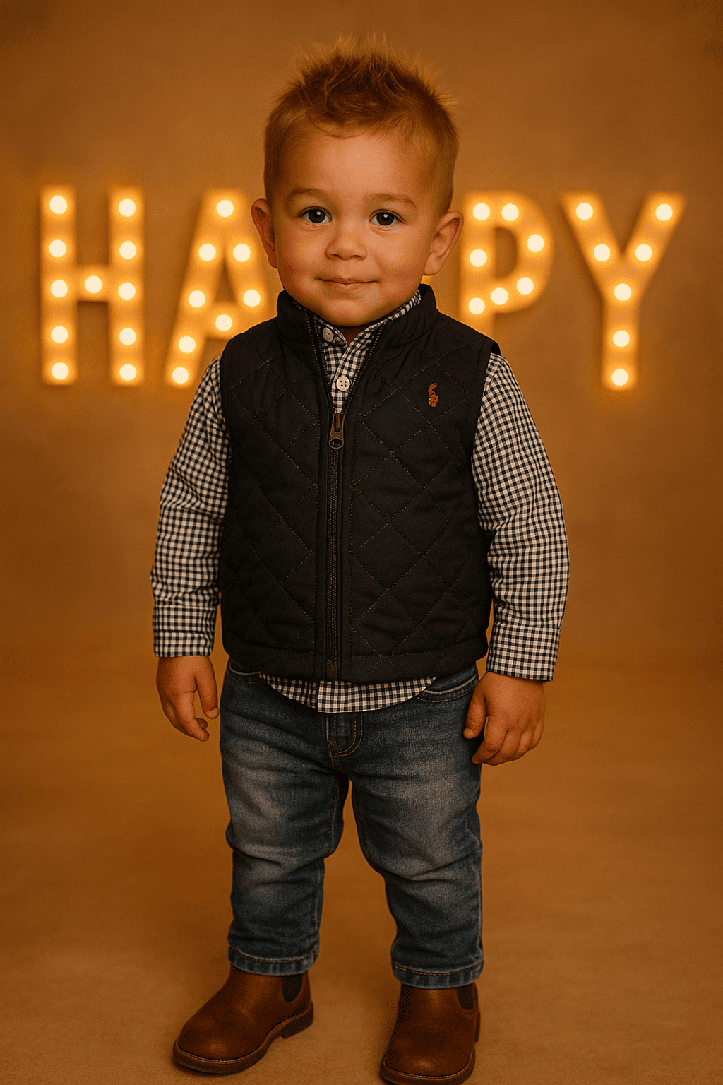 Colete azul marinho, da marca Onda Marinha, veste tamanho 2 anos, tecido de poliéster e algodão.