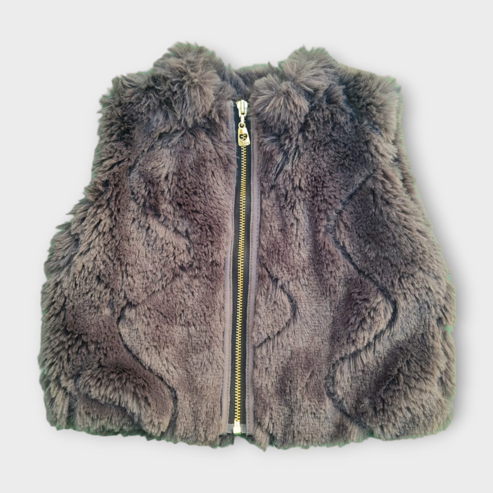 Colete infantil desenvolvido em tecido peluciado de toque macio, com composição em poliéster e algodão, ideal para os dias mais frios. Possui fechamento frontal com zíper dourado de destaque e puxador personalizado em formato de coração. O modelo conta com gola alta, acabamento interno em malha e padronagem ondulada na textura do pelo, proporcionando charme e conforto térmico.
