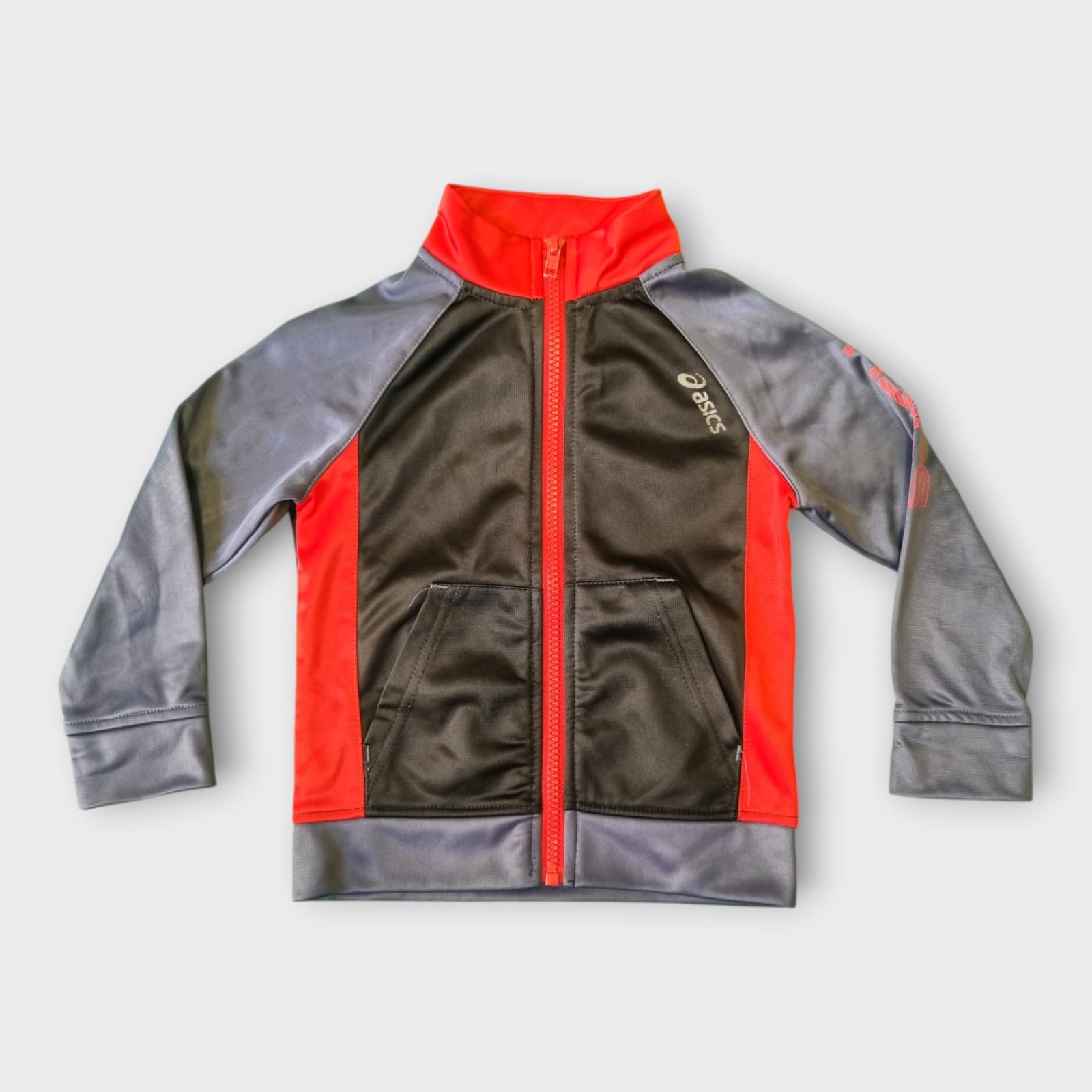 Jaqueta esportiva infantil da marca Asics, confeccionada em malha de poliéster com leve brilho, ideal para atividades físicas ou uso casual. O modelo apresenta combinação de cores em preto, vermelho e cinza, com fechamento frontal por zíper contrastante. Possui gola alta, bolsos frontais estilo canguru e mangas longas com recorte raglan que proporcionam maior mobilidade. A logo Asics aparece aplicada no lado esquerdo do peito, conferindo autenticidade à peça. Leve, prática e confortável, é perfeita para os dias mais frescos. Tamanho 3 anos.
