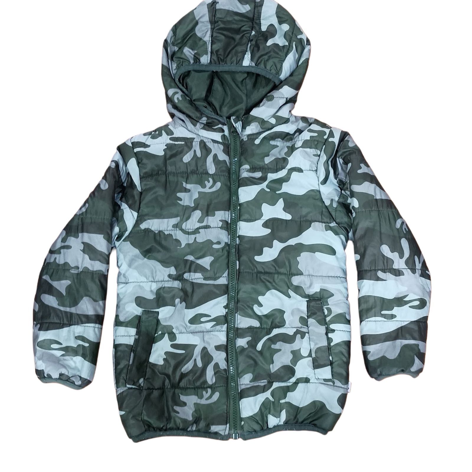 Jaqueta acolchoada em estampa camuflada com tons de verde musgo e cinza claro em toda a peça. A peça da marca Tip Top possui capuz integrado, fechamento frontal por zíper em cor verde e bolsos laterais funcionais. Conta com punhos e barra em elástico para melhor ajuste e proteção térmica, além de enchimento leve que garante aquecimento sem perder o conforto. O design moderno e o caimento estruturado tornam o modelo ideal para dias frios.