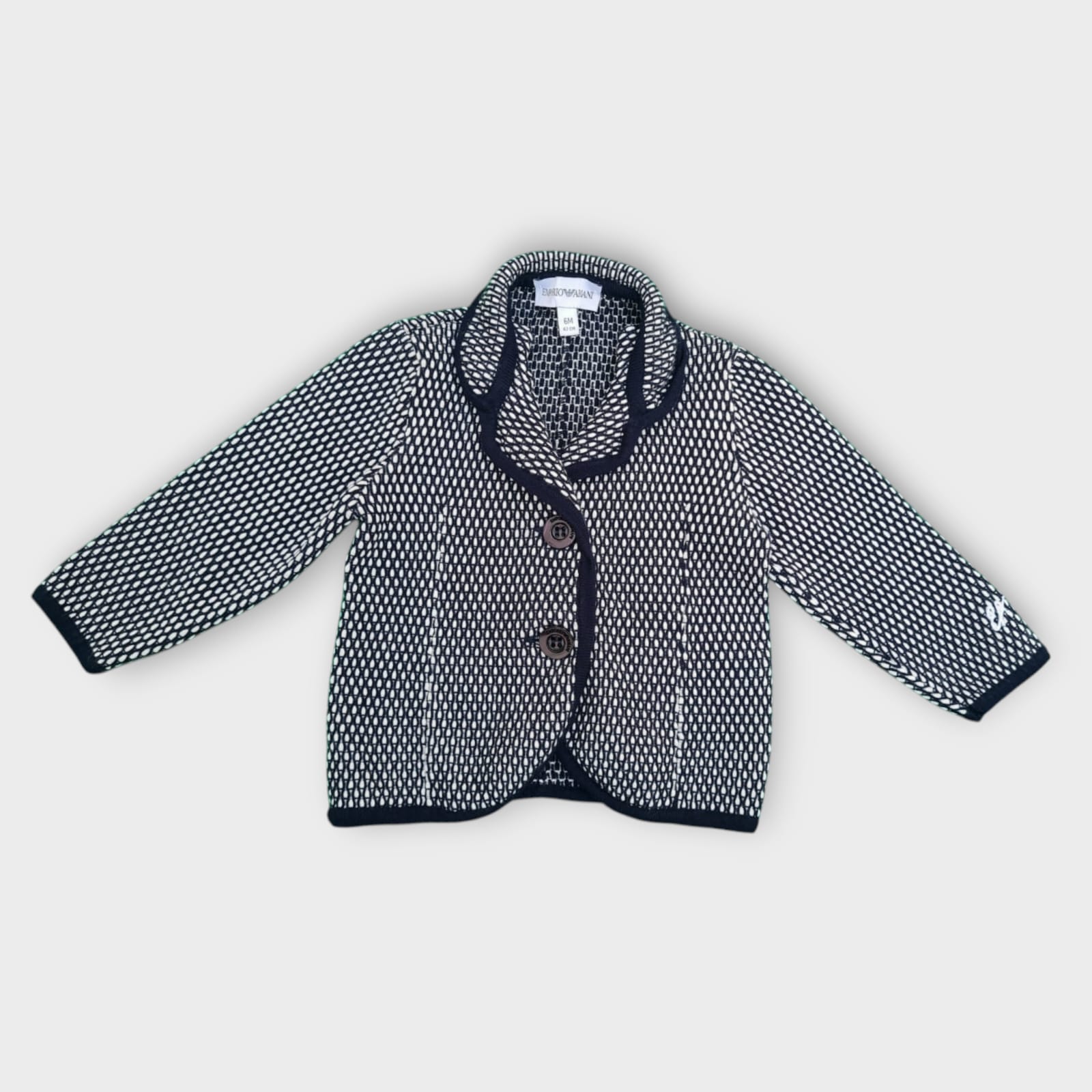 Casaco Emporio Armani confeccionado em malha de algodão com padronagem geométrica em preto e branco. Modelo de mangas longas, gola com acabamento arredondado e fechamento frontal por dois botões. Possui contorno em tricô preto contrastante e logo da marca bordado discretamente na manga. Peça de toque macio e caimento estruturado, ideal para compor looks elegantes e confortáveis.