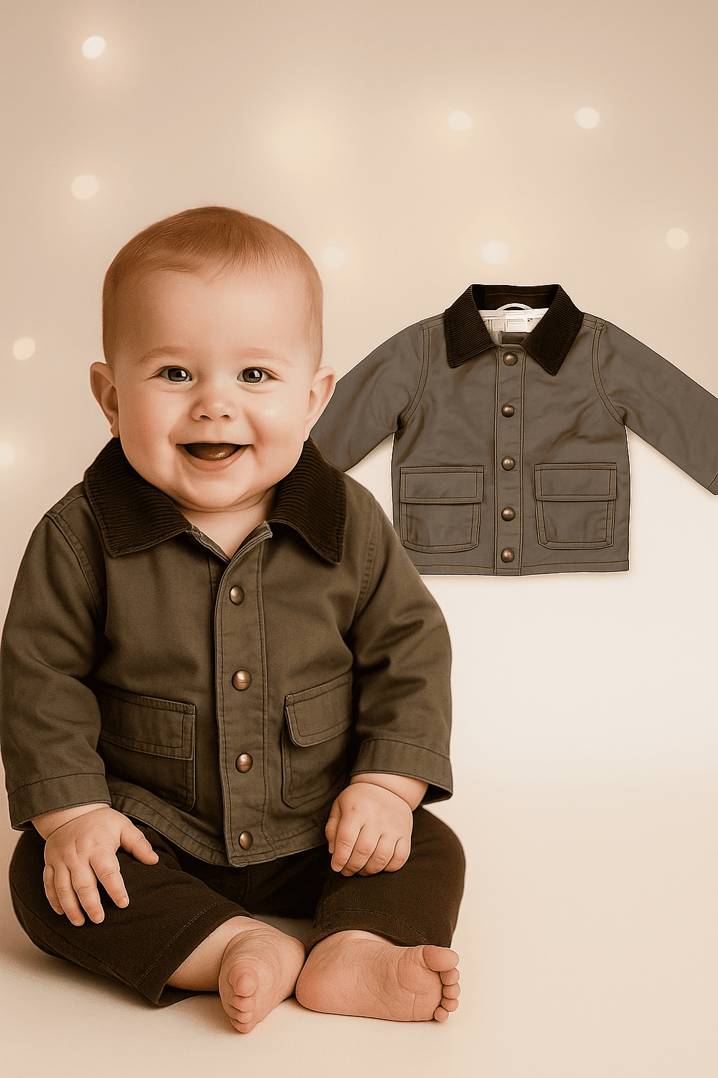 Jaqueta da marca Baby Gap confeccionada em tecido estruturado na cor marrom. Possui gola em veludo cotelê no tom marrom mais escuro, fechamento frontal por botões de pressão metálicos e dois bolsos frontais com aba. Forro interno em estampa xadrez, que garante um toque clássico e aconchegante. Peça versátil, ideal para proteger nos dias mais frios com estilo.