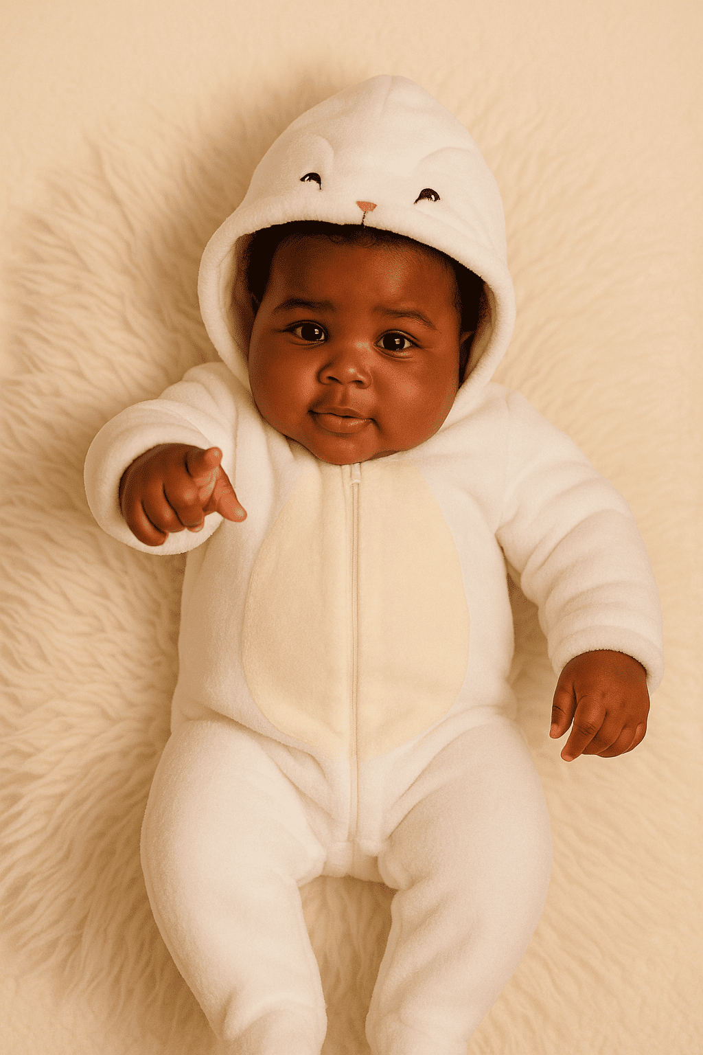Macacão da marca Nick, na cor branca e com rostinho e orelhinha na touca; veste tamanho M; perfeito para o inverno!