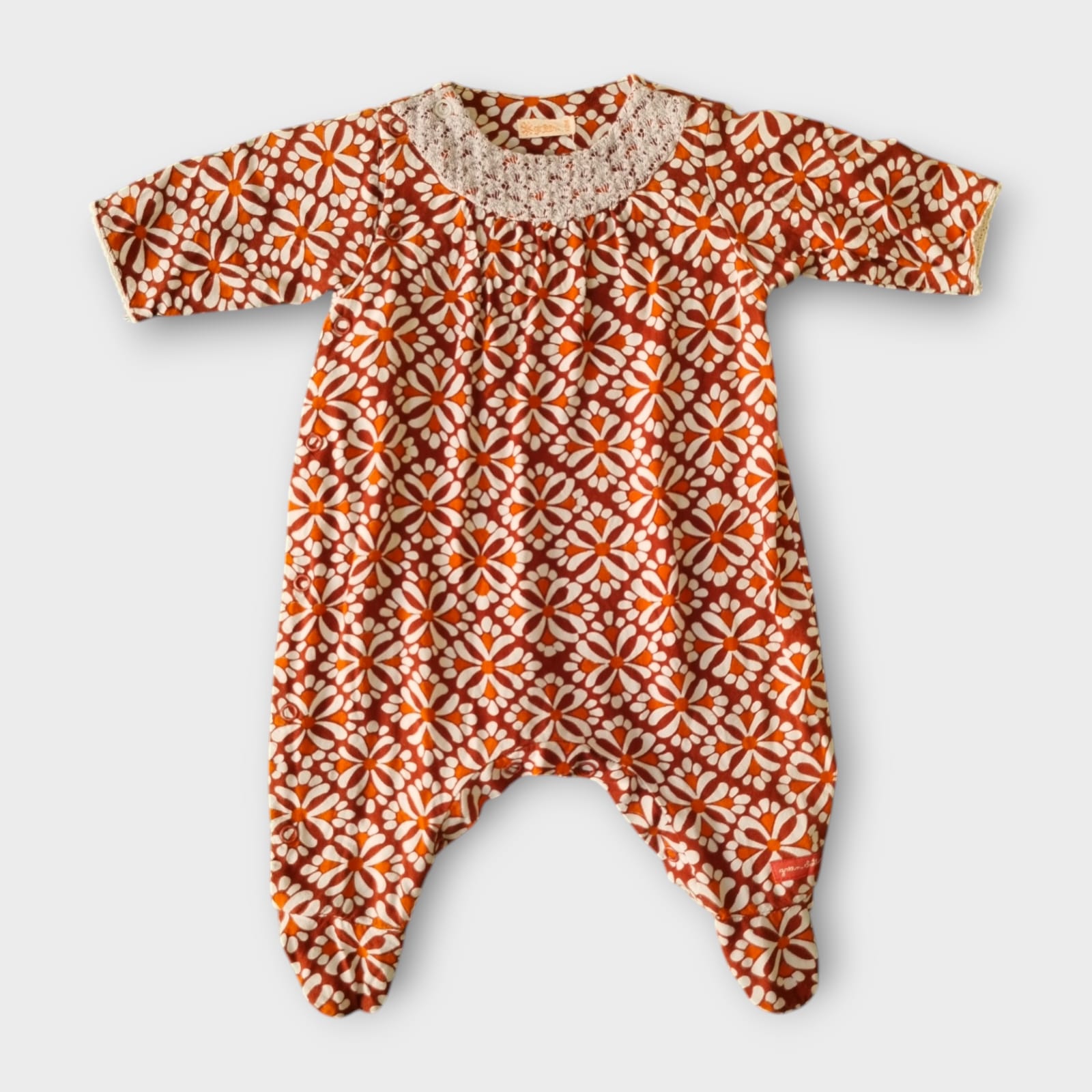 Macacão bebê da Green, todo estampado, com detalhe em renda na gola, possui os pés fechdos; tamanho de 1 - 3 meses; tecido bem leve e fininho!