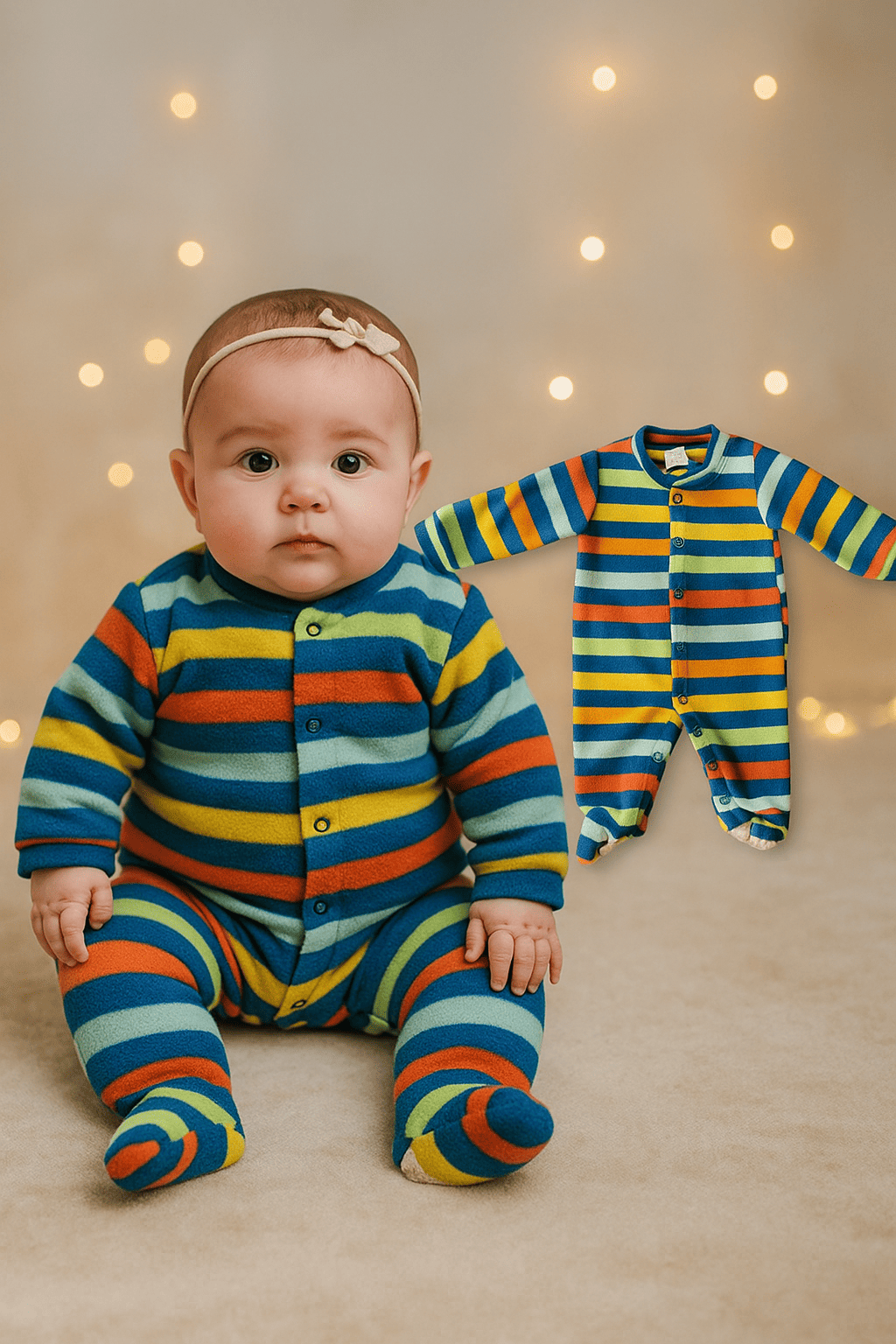 Macacão Tip Top confeccionado em fleece macio e aconchegante, com estampa listrada multicolorida em tons vibrantes de azul, verde, laranja e amarelo. Modelo de manga longa com pezinho fechado, proporcionando máximo conforto térmico. Possui fechamento frontal por botões de pressão, que facilitam a troca de roupas e fraldas. Ideal para manter o bebê aquecido e confortável nos dias mais frios.