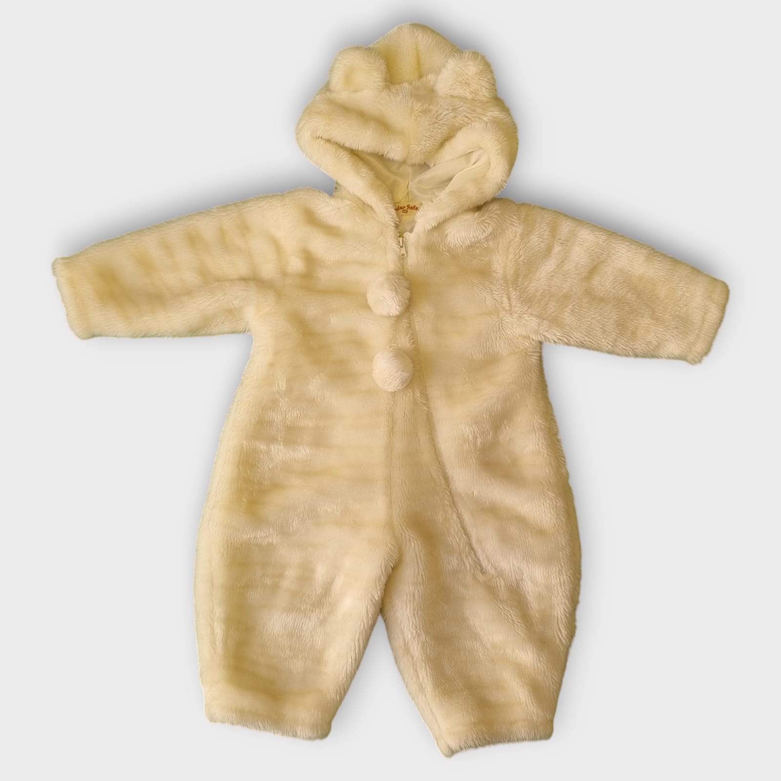 Macacão Peluciado Kinder Safari branco, com pompons na frente e com orelhinhas no gorro, veste tamanho de 2 a 3 anos, perfeito para os dias frios!