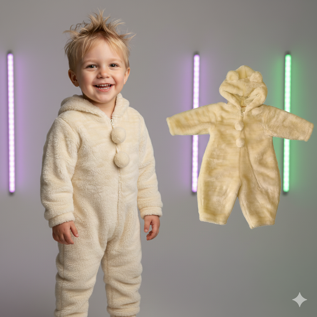 Macacão Peluciado Kinder Safari branco, com pompons na frente e com orelhinhas no gorro, veste tamanho de 2 a 3 anos, perfeito para os dias frios!