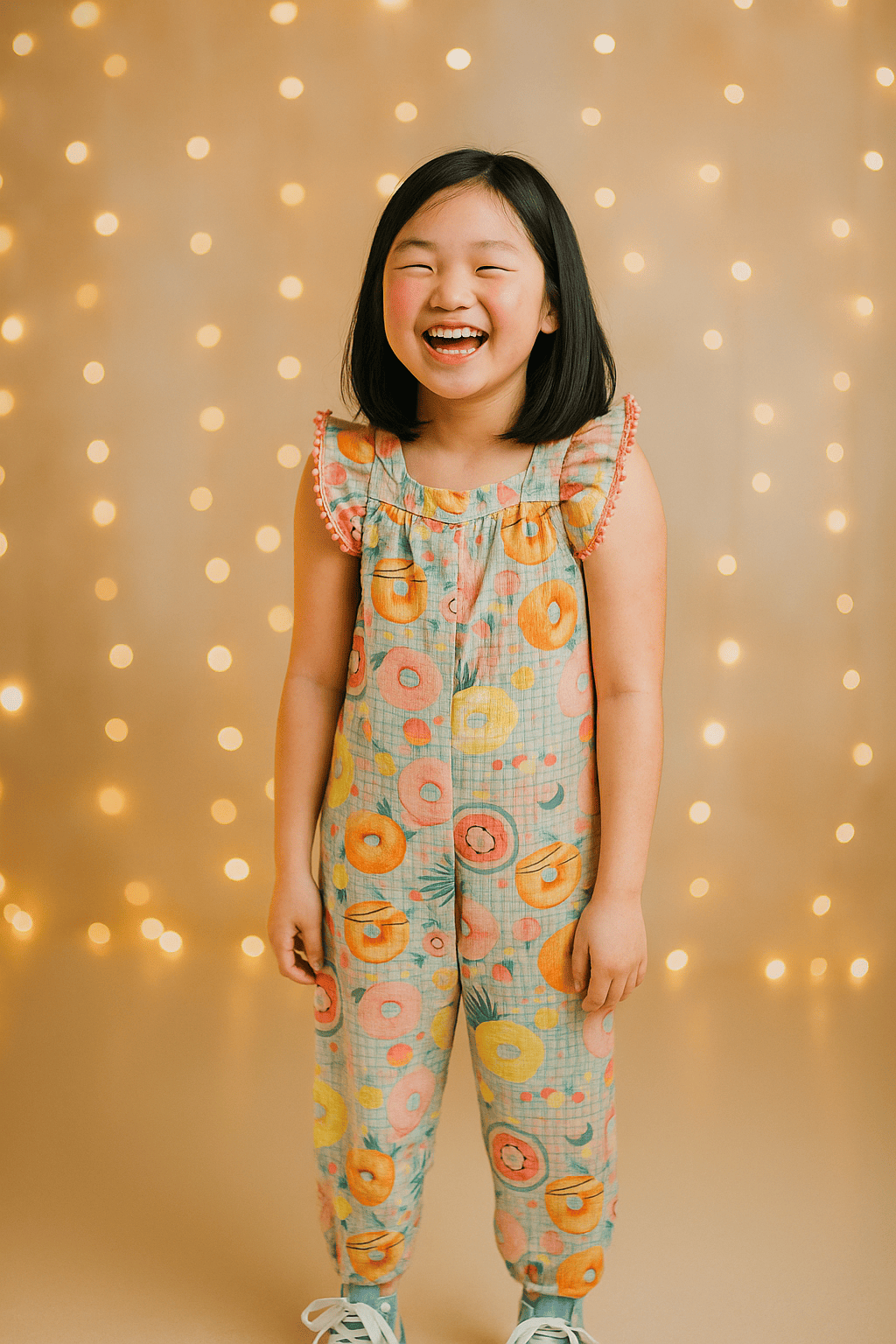 Apresentamos um divertido macacão infantil longo, perfeito para os dias quentes com um toque de alegria e conforto! Este macacão é em um vibrante tom de azul claro com estampa quadriculada discreta, e é adornado com uma estampa lúdica de frutas e donuts em cores pastéis como rosa, laranja, amarelo e verde.