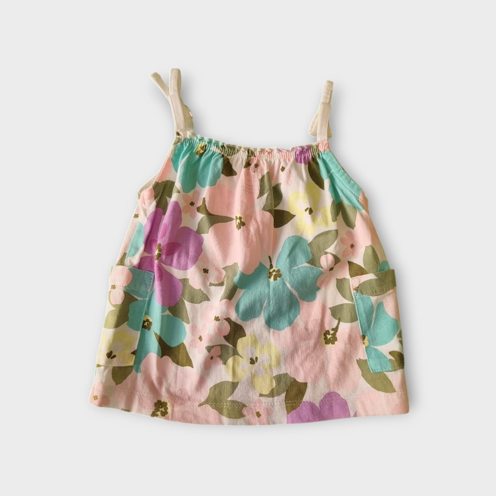 Regata estampada com flores coloridas da maraca Carter's, no tamanho 6 meses; tem detalhe de laço nas alças, é bem soltinha e fica linda em ocasiões e eventos ao ar livre!