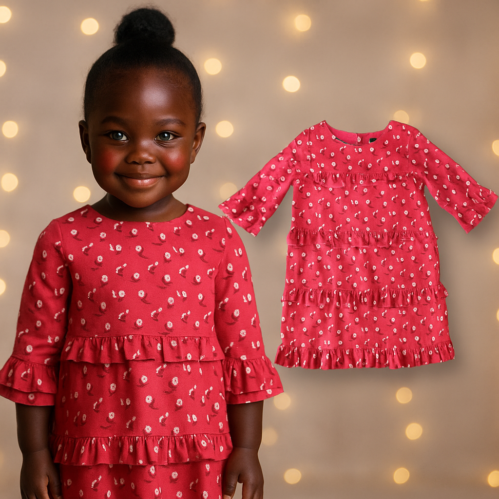 Vestido da marca Baby Gap confeccionado em tecido leve, com modelagem reta e mangas 3/4. Possui estampa floral miúda em branco sobre fundo vermelho vibrante. O design é enriquecido por babados aplicados na parte frontal, nas mangas e ao longo da barra, conferindo movimento e delicadeza. Fechamento posterior por botão, garantindo praticidade.