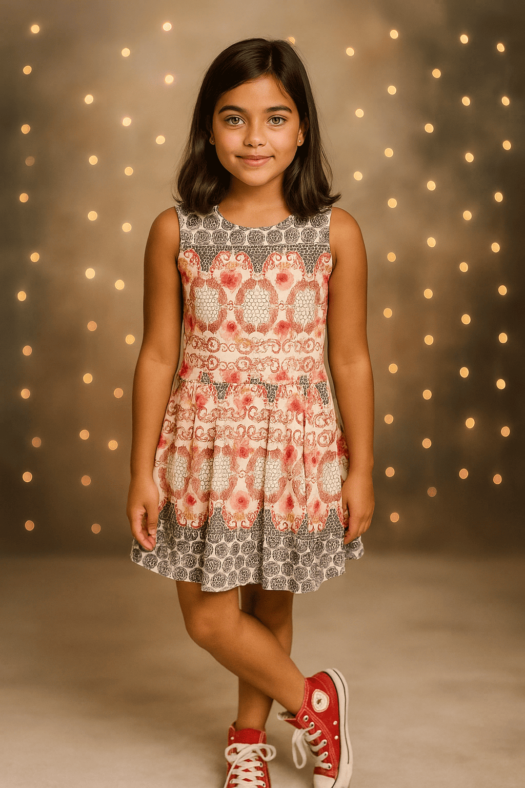 Vestido da marca Matinée, confeccionado em tecido estruturado com estampa sofisticada que combina elementos geométricos em preto e branco com detalhes florais em tons de vermelho, rosa e dourado. O modelo é sem mangas, possui decote redondo e saia rodada com pregas que conferem volume e movimento elegante. Uma peça refinada, ideal para ocasiões especiais e eventos formais.