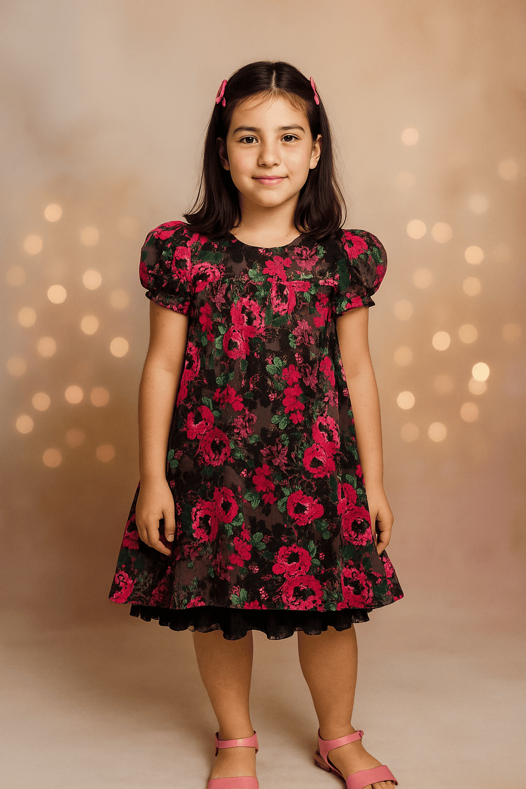 Vestido da marca Animê, confeccionado em tecido leve com estampa floral vibrante em tons de rosa, verde e roxo sobre fundo escuro. O modelo apresenta mangas curtas bufantes, recorte na altura do busto que proporciona volume ao caimento e detalhe da plaquinha metálica da marca aplicada na parte frontal. Possui forro interno para maior conforto e acabamento refinado. Uma peça elegante e charmosa, ideal para ocasiões especiais.