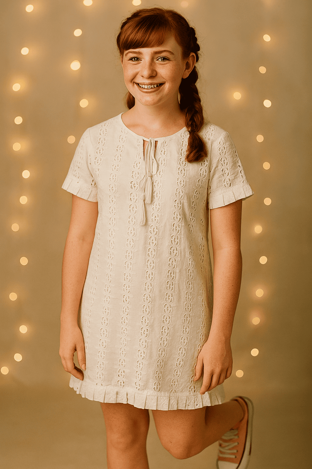Vestido da marca Tre Gocce, confeccionado em tecido branco com bordado em renda estilo laise. O modelo possui mangas curtas, decote arredondado com abertura em amarração e detalhe de tassel, além de barra com leve babado, que acrescenta delicadeza ao visual. Uma peça charmosa e versátil, ideal para composições casuais elegantes.