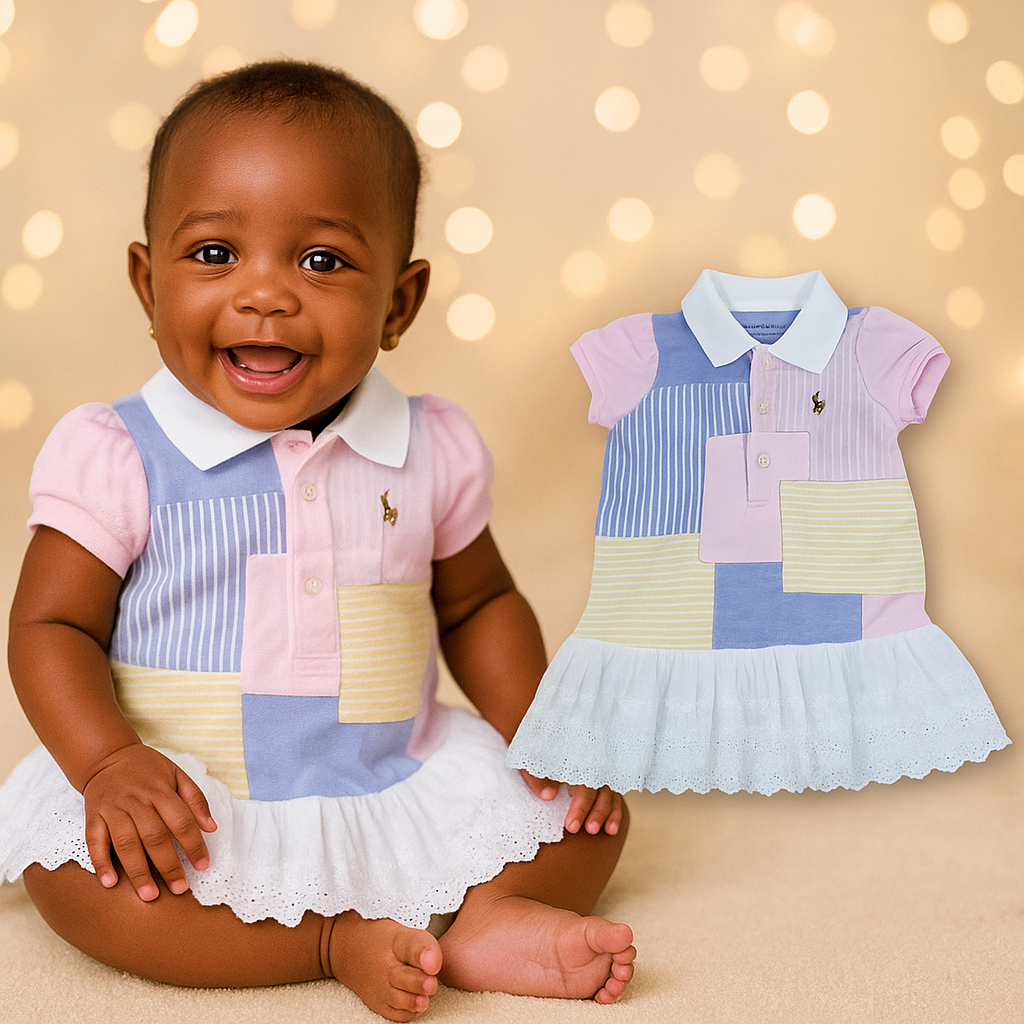 Com um design encantador e uma gola polo, o vestido combina estilo e praticidade, tornando-se uma peça versátil para o guarda-roupa infantil. Seu comprimento curto e mangas curtas garantem frescor e elegância, permitindo que as bebês se sintam à vontade enquanto exploram o mundo ao seu redor.